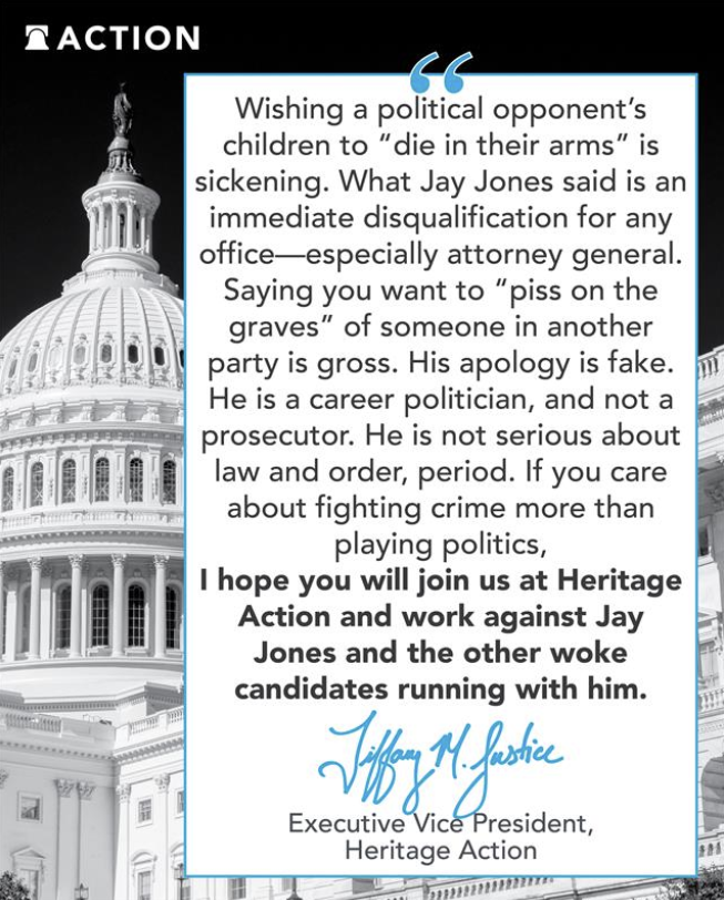 “I hope you will join us at Heritage Action and work against Jay Jones and the other woke candidates running with him in the House of Delegates.”